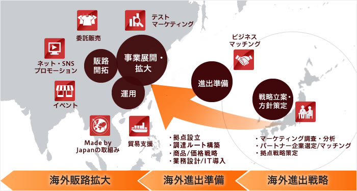 次に、調達ルートの構築、商品/価格戦略、業務設計/IT導入、契約/現地法人設立などの準備を行います。「現地法人の設立までは考えていない」という場合でも、テスト販売や展示会出展など、何らかの方法で現地における自社商品の反応をはかる準備をしておくことが望ましいでしょう。